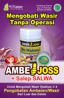 AMBEJOSS DE NATURE obat Ambeien atau obat wasir, Obat alami berkhasiat dalam bentuk kapsul yang berasal dari tanaman herbal seperti daun ungu, mahkota dewa dan kunyit putih, diberikan pada penderita jika penyakit masih dalam tingkatan stadium ringan. Kapsul ini biasanya dikemas dalam jumlah sebanyak 50 kapsul.